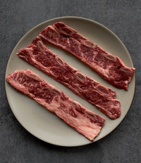 Our American Wagyu Kalbi is a thin Korean horizontal cut from the chuck-end of the short rib. Unlike American and European-style short ribs, Korean-style short ribs are cut lengthwise across the rib bones, making them a bit easier and cleaner to eat. Fantastic when grilled, this cut has intense and intricate marbling, always yielding a fantastically juicy, succulent texture.