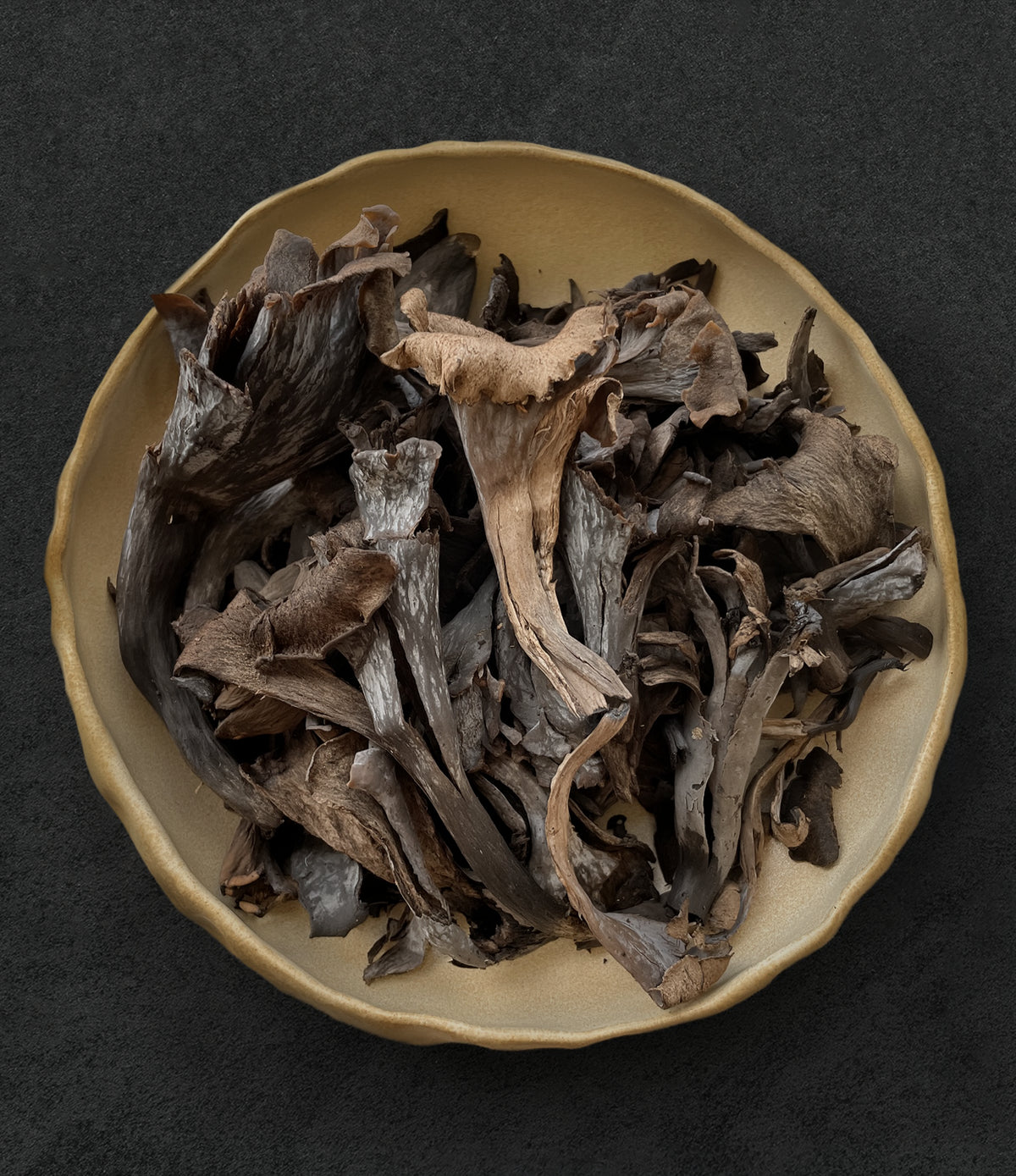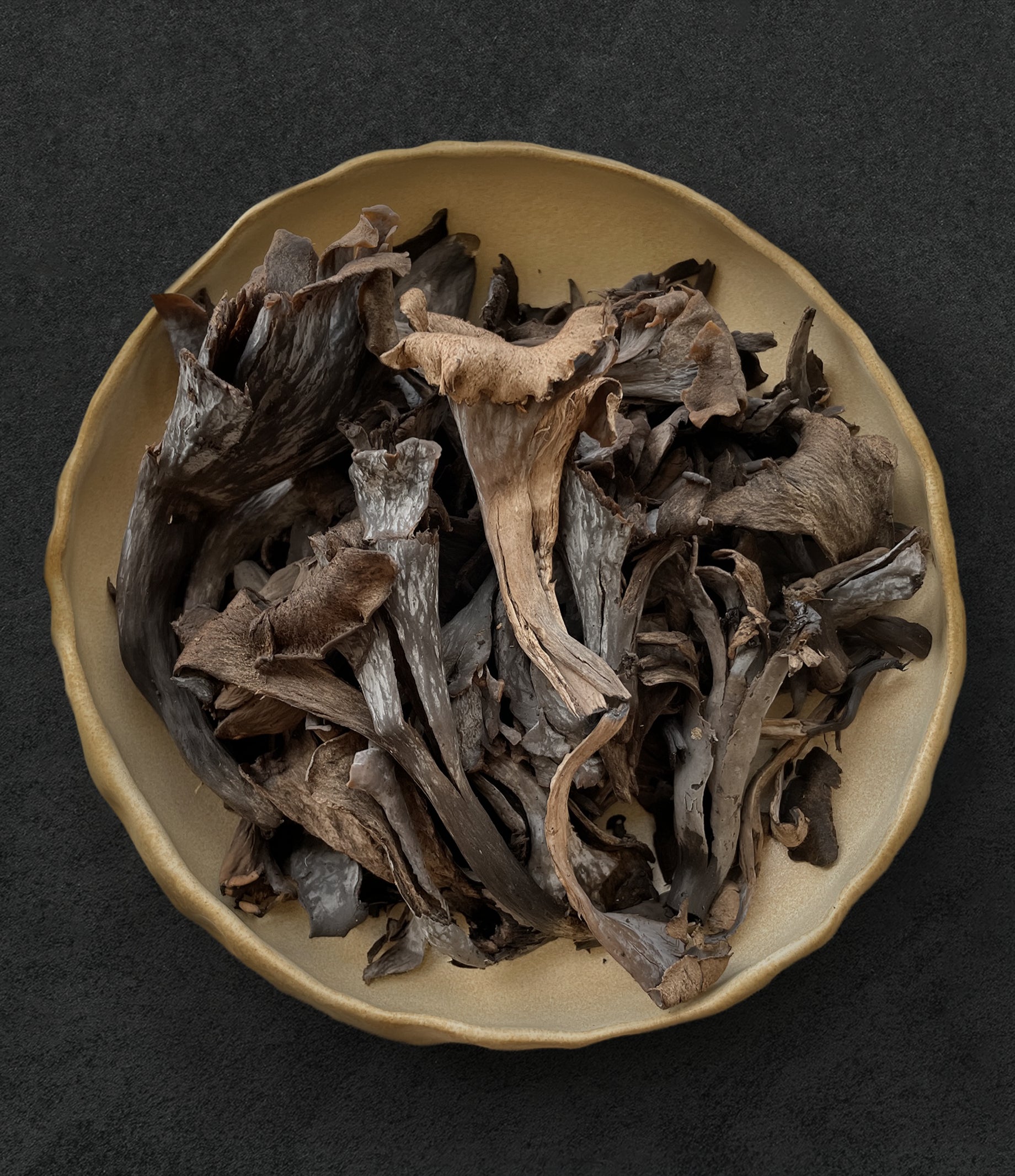 These mushrooms look like Chanterelles dipped in satisfyingly dark ink, and they go by many names: Black Trumpet, the Horn of Plenty, the Trumpet of the Dead. Aside from clearly claiming the enviable distinction of “most metal mushroom,” Black Trumpets distinguish themselves with a smoky aroma reminiscent of black truffles, exquisite when cooked on their own or incorporated into a sauce. We especially enjoy folding Black Trumpets into a cream sauce, as their character not only beautifully enlivens the flavor profile, but their color imbues the dish with an entrancing, otherworldly allure.
