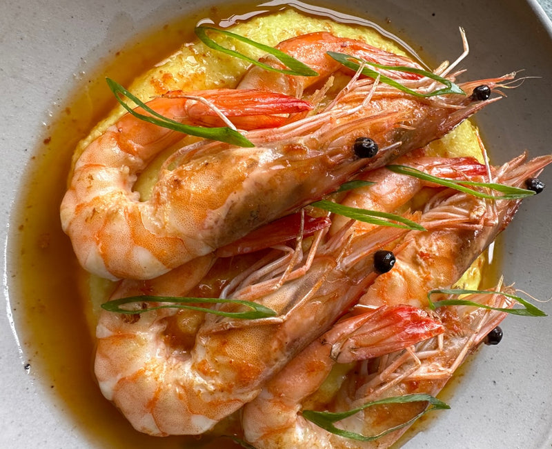 Saffron grits, blue prawns, moromi chilli butter, scallion.