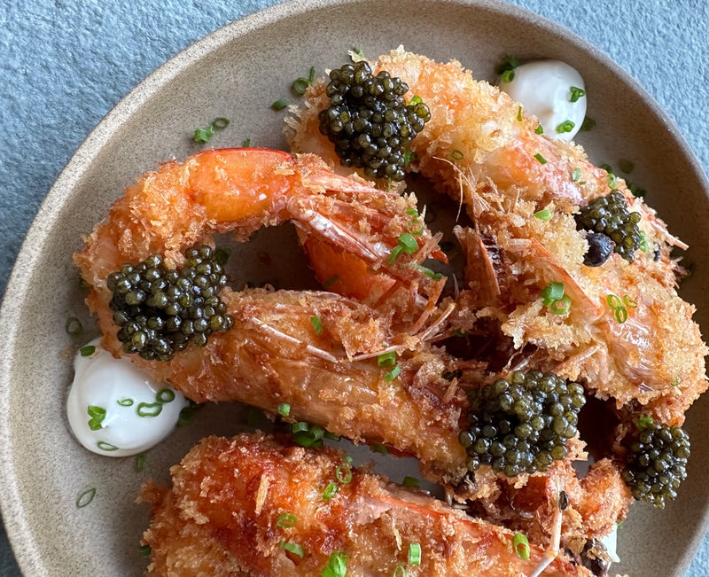 Panko crusted blue prawns, crème fraiche, chives, caviar