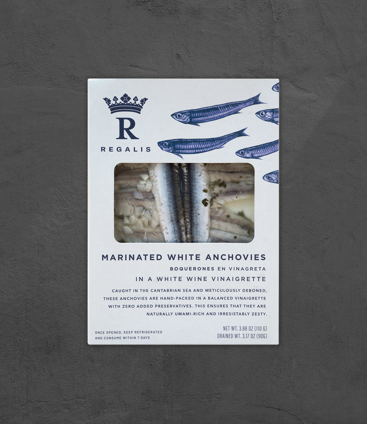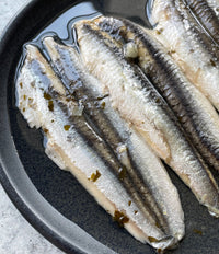 Lightly pickled in vinegar, these marinated white anchovy filets are irresistibly zesty. Caught in the Cantabrian sea off the northern coast of Spain and meticulously deboned, they are hand-packed in a balanced vinaigrette with zero added preservatives. Naturally umami-rich and ready to eat, lay them atop buttered sourdough or build a plate of gildas with our pitted Gordal Olives and Piparra Peppers.