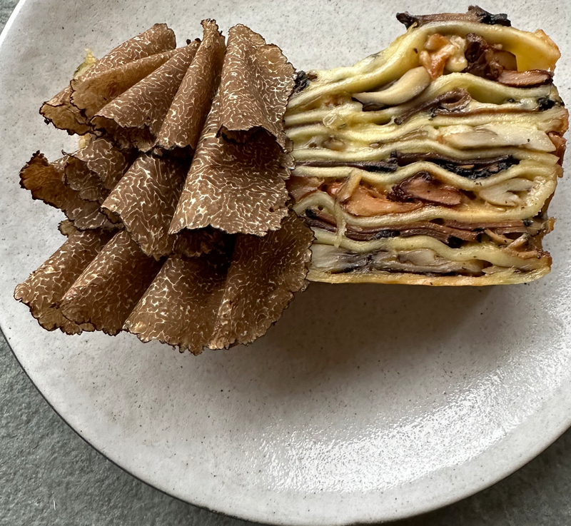 Chanterelle, maitake, and truffle carpaccio, white lasagna, burgundy truffle