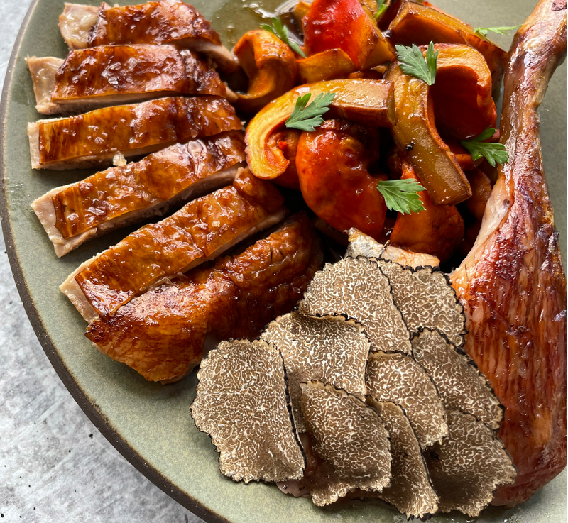 Roasted Peking style duck with rye shoyu, lobster mushroom, burgundy truffle, and parsley