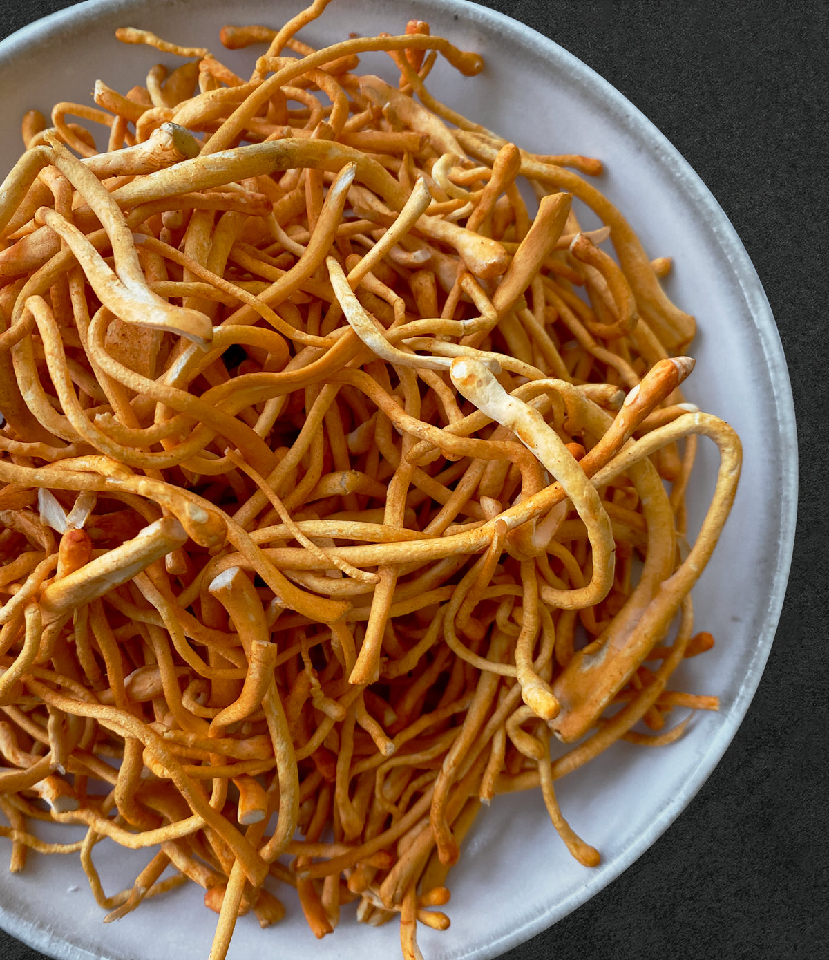 Our Cordyceps come in sturdy strands that hold up very well to frying. On their own, they make a great side dish, and can also be tossed onto a sandwich or salad if sauteed just enough to lend some extra crunch and umami. When opting for more elaborate preparations, these mushrooms add incredible depth to stews and roasts, and their atypical shape gives them a degree of versatility that eludes many other mushrooms.