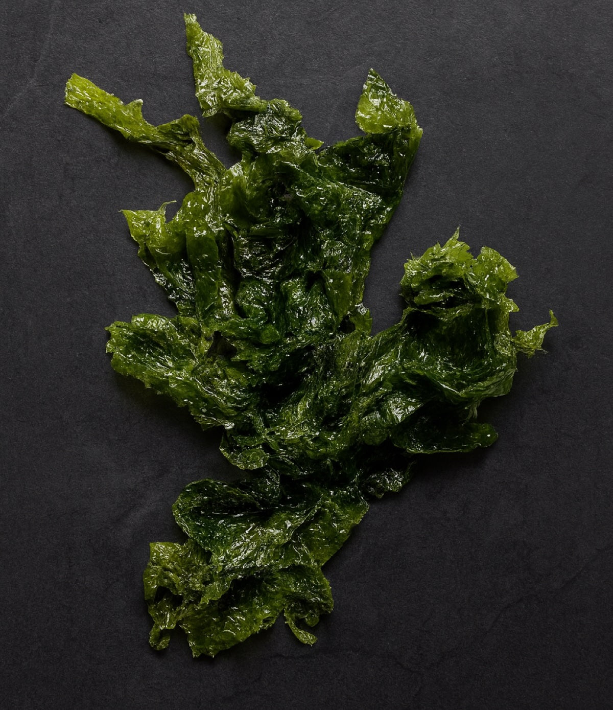 Sea Lettuce is a fun, versatile seaweed, with an elastic texture that crisps up nicely once toasted, and an intensely saline aroma reinforced by flavors that remind us of fresh mussels or clams. Though delightful as a focal point or key salad component, sea lettuce is also a sneakily superb additionto soups and broths. Preserved only with salt, we recommend three thirty-second cold water rinses before preparation.