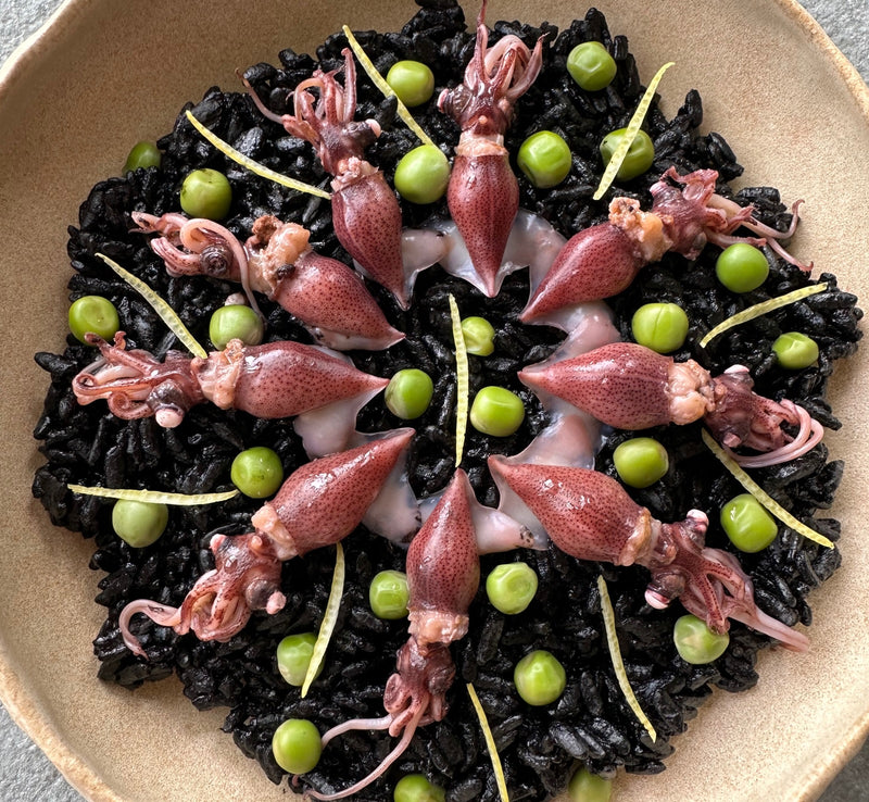 Cuttlefish ink rice, firefly, spring peas, lemon