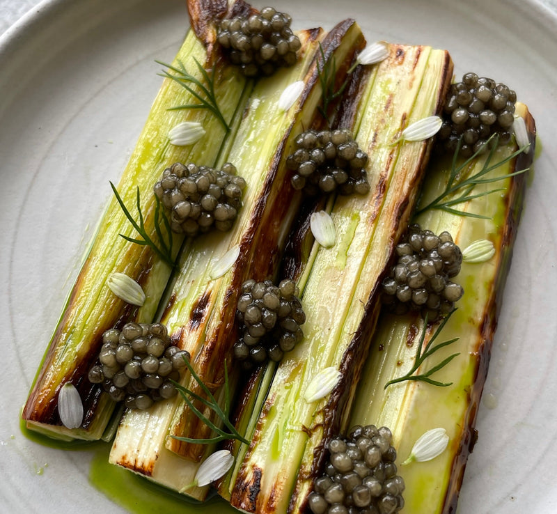 Charred hearts of palm, golden Osetra, herb oil, dill, chamomile