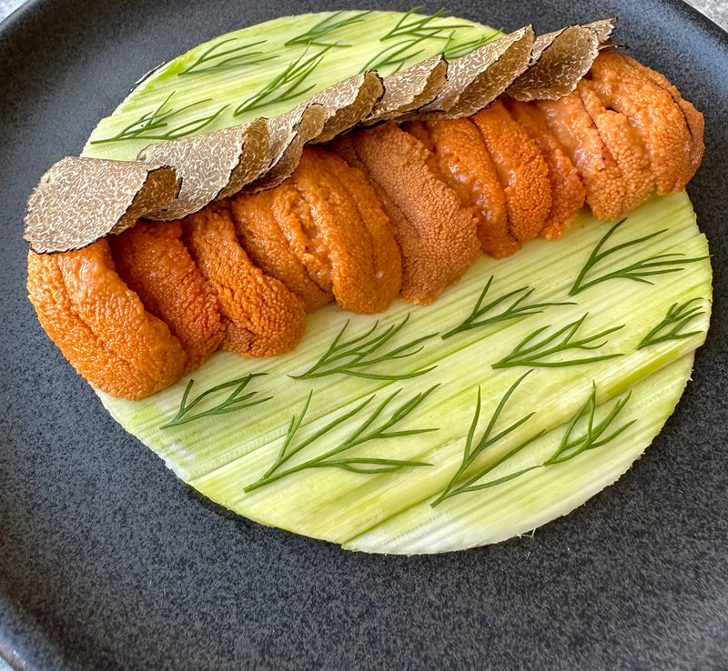 Pressed heart of palm, Uni, burgundy truffle, dill, herb oil