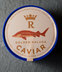 Our Large Grain Golden Kaluga Hybrid (acipenser schrencki x huso daricus) is an extremely firm, bright gold hued caviar. It is clean and buttery, with fantastic pop and mouthfeel. An excellent option...