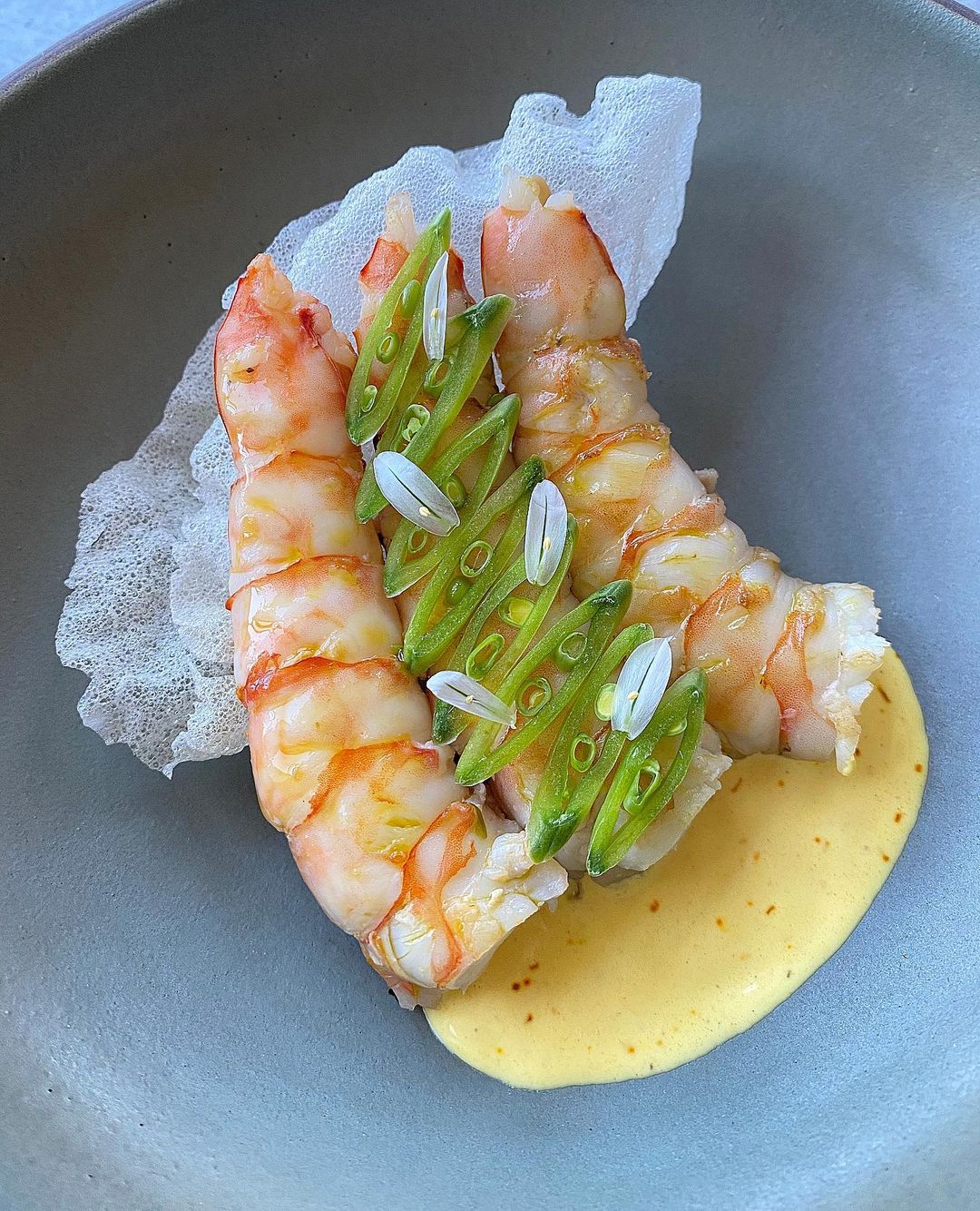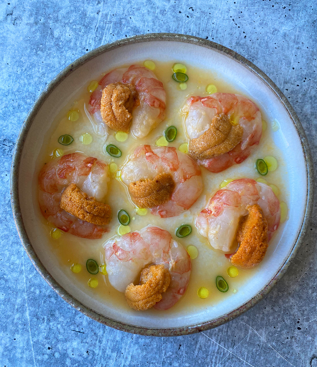 Spot prawn, spot prawn roe, yuzu, yuzu oil