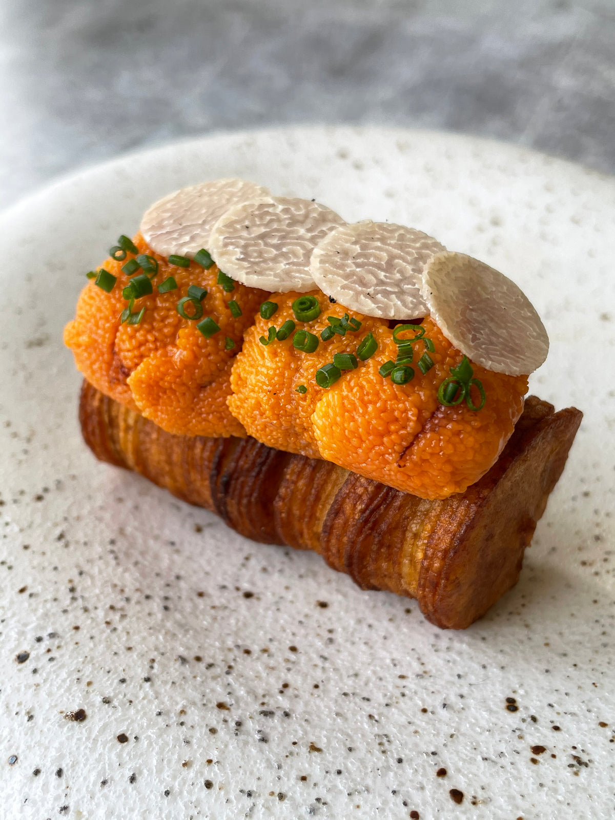 Crispy rice, white tamari cured egg, Regalis nori, Maine uni, queens bucket sesame.