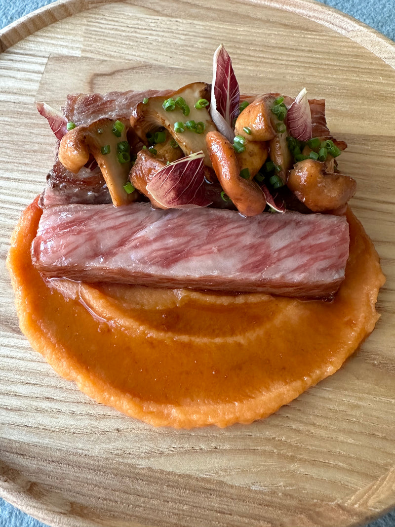 Honey nut squash puree, A5, chanterelle, chive, radicchio