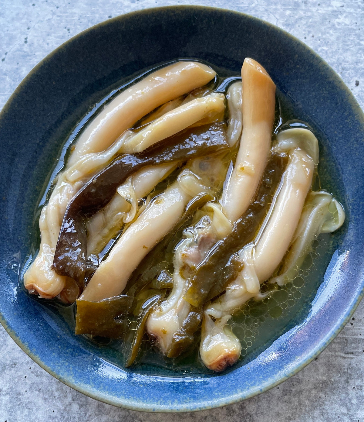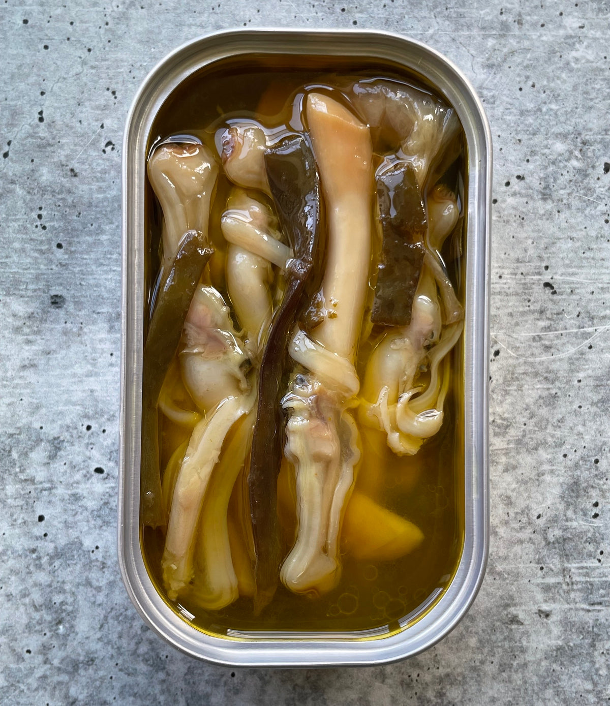 Our partners in Galicia, Spain are best known for their wide range of diver-caught seaweeds, and we are thrilled to now offer a pair that combines these exquisite sea greens with equally superb shellfish. This one features razor clams with sea spaghetti — a complex and hearty enough duo to make a meal on their own. The razor clams’ distinct, tangy flavor and firm texture melds beautifully with the earthy, salty-sweetness of the sea spaghetti, making this an incredibly satiating snack or an inspiring element of any conserva board.