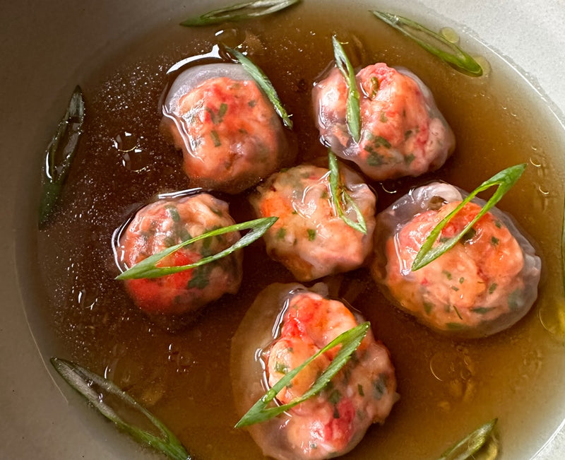 Rice paper carabinero wonton with chives, wonton broth, scallions
