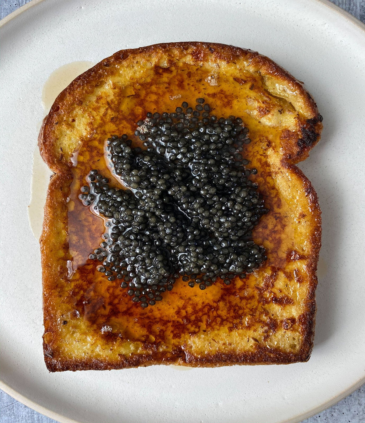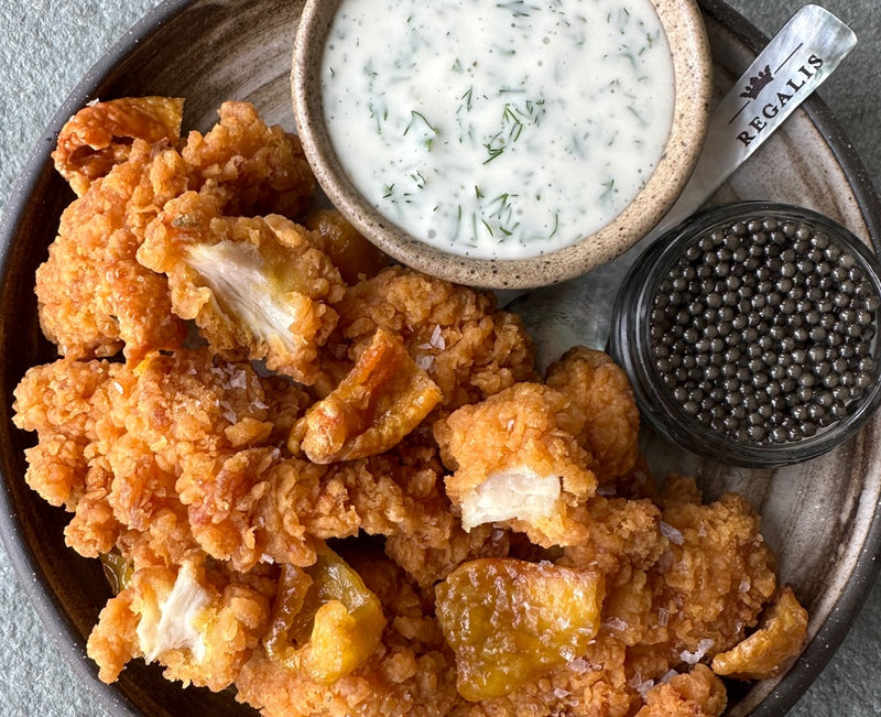 Golden chicken nuggets, crispy chicken skin, ranch, platinum osetra caviar.