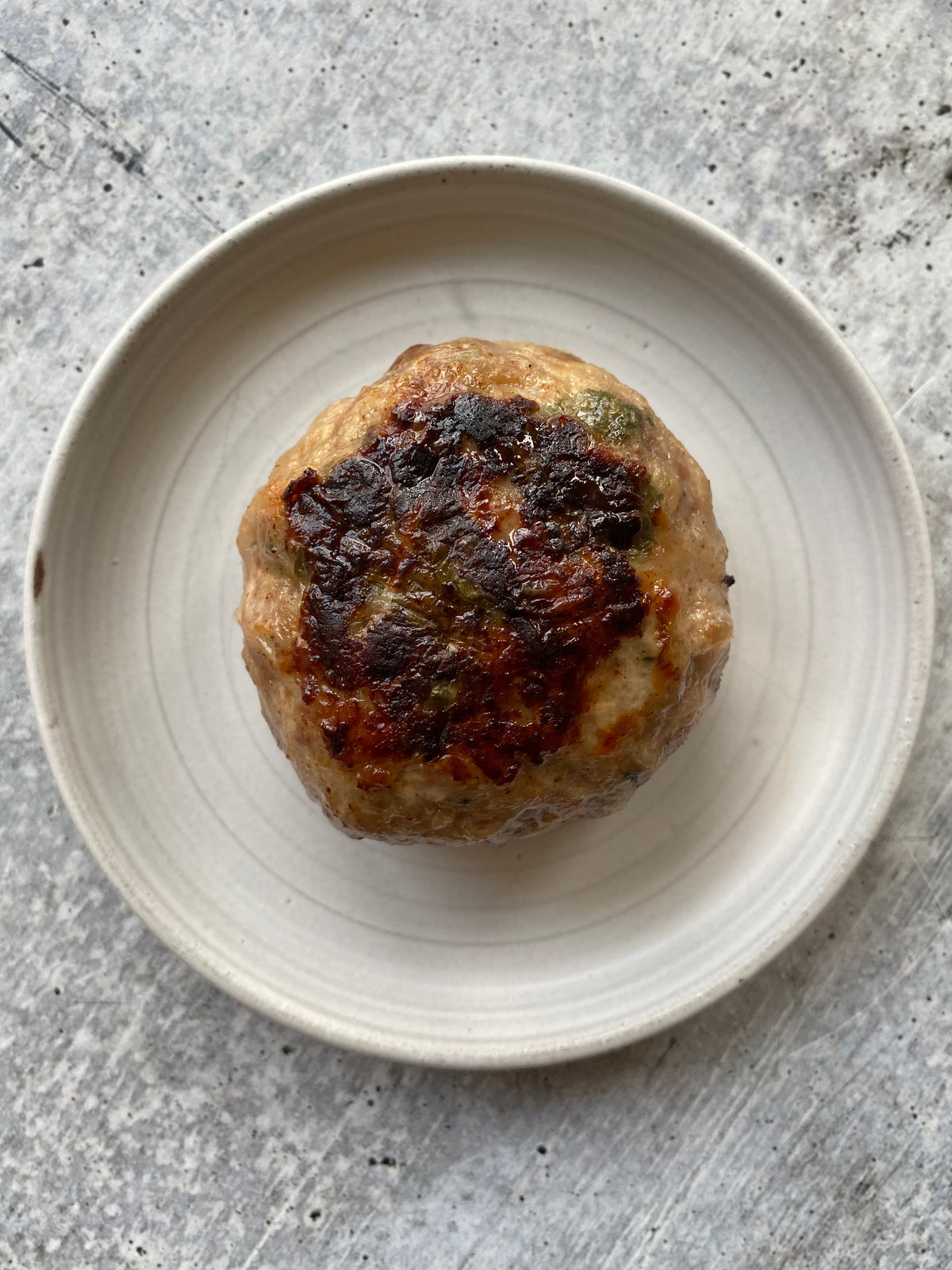 To cook, set the crépinette seam side down in a large sauté pan and turn the heat to medium-high. When it starts to sizzle, turn the heat down to medium and let it sizzle gently for 5 minutes or so. When the seam side is nicely browned, flip and cook for another 6-8 minutes on the other side until golden brown and internal cooking temperature reads 160*F.