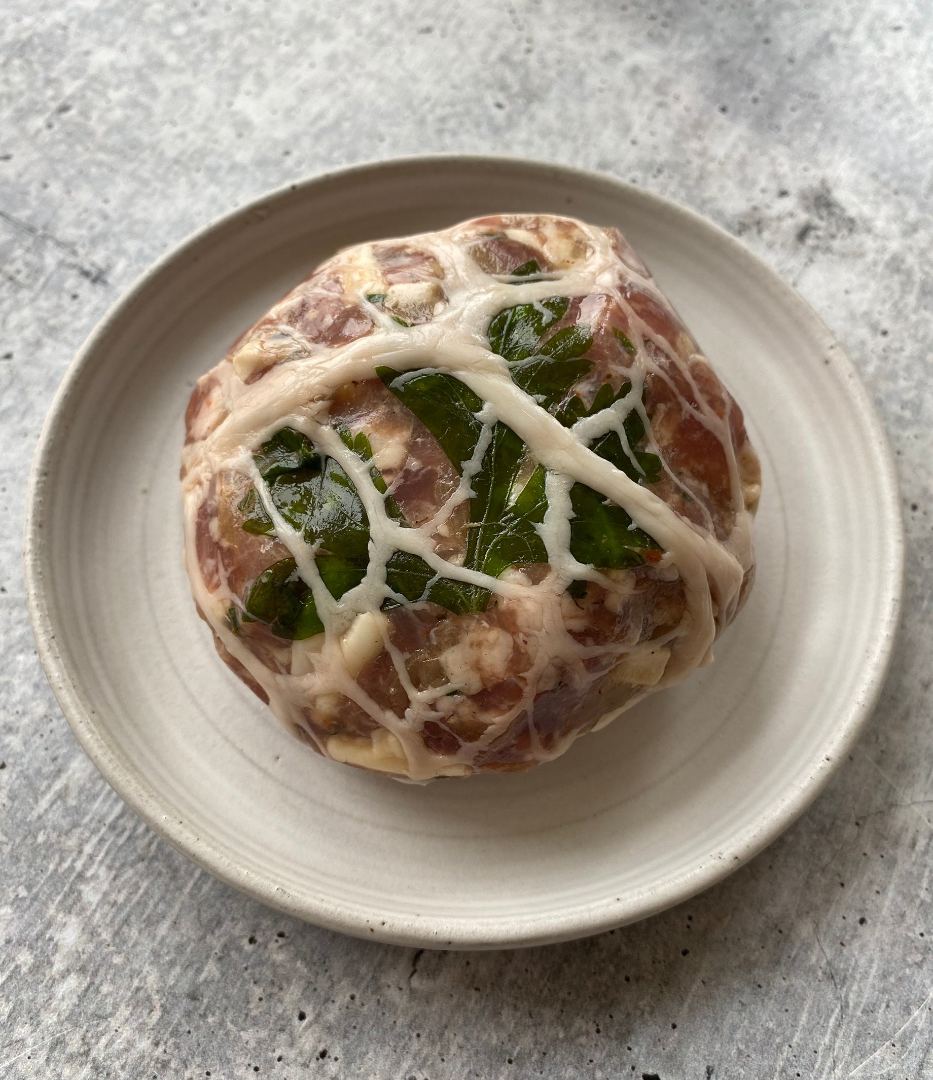 The Crépinette is made with free-range pork, swiss chard, and sharp cheddar cheese wrapped in a lace of delicate caul fat. The fanciest cheesy sausage in the world. Allergens: pork, dairy...
