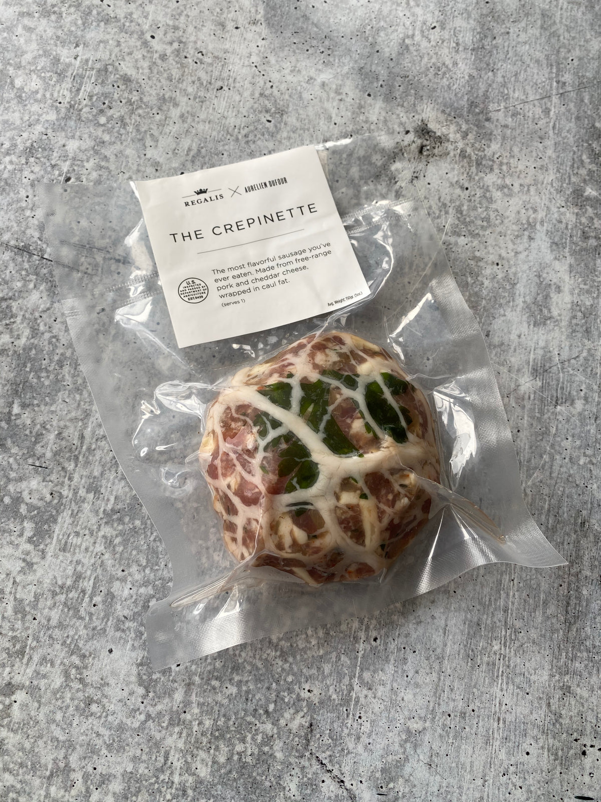 For nearly a decade, Regalis has traveled the globe in pursuit of the finest ingredients in the world. Along the way we’ve dreamt up many recipes for culinary creations. In partnership with famed artisan of charcuterie Aurélien Dufour, who spent years perfecting his craft under the prestigious chef Daniel Boulud, we’ve created this crepinette with a decadent blend of the finest pork, spices, greens, and cheddar cheese. Classic French technique with artisan Regalis raw ingredients brings a chef’s touch to the home kitchen. Behold, the crepinette.