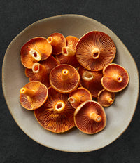 No foraged mushroom has been celebrated longer than Saffron Milk Caps, with their iconic figure featuring prominently as far back as a fresco from the Roman ruins of Herculaneum. They remain beloved across the pond, known as Rovellons or Níscalo in Spain, where still no other mushroom wins more affection. Although fleeting shelf life makes importing them impractical and disappointing, there are select pockets in the US where they grow wild. All of these selections were hand foraged by our founder, Ian Purkayastha, in western Massachusetts.