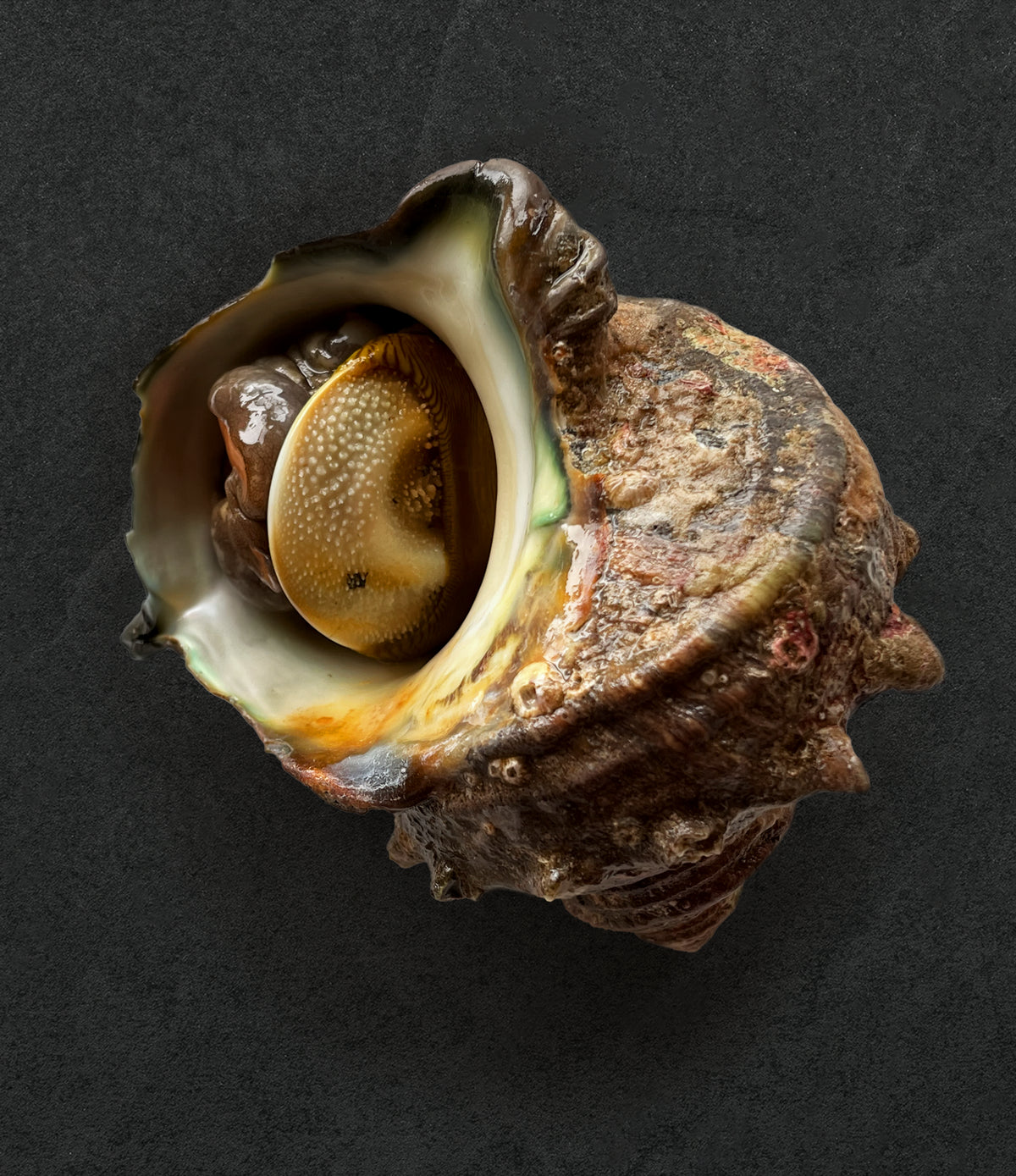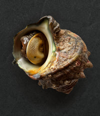 Sazae Snails are typically fished from late spring through summer, when they can be retrieved from relatively shallow coastal waters, feeding on all sorts of algae and seaweed. In Japanese folklore, the Sazae Oni (turban shell demon) exists as an amusingly menacing human/sea snail amalgamation that pilfers testicles from pirates, perhaps deservingly, depending on which variation of the tale is favored. Our catches, from Japan’s Chiba Prefecture, are known to do no such thing.