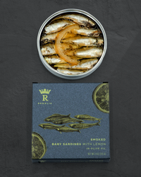 Wild harvested in the Bay of Biscay off the coast of Galicia, each sardine is gently steamed, then deboned by hand and submerged in grassy olive oil. This process produces an especially tender texture with zero fishiness. Gently smoked over beech and topped with a sliver of fresh hand-cut lemon for added acidity.