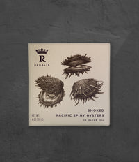 Shucked by hand, these wild spiny oysters are sourced from the chilly waters of Galicia. Large in size, spiny oysters are unique in flavor and texture. Extremely plump, each oyster is impeccably sweet with a light lingering brine. Delicately smoked over beech.