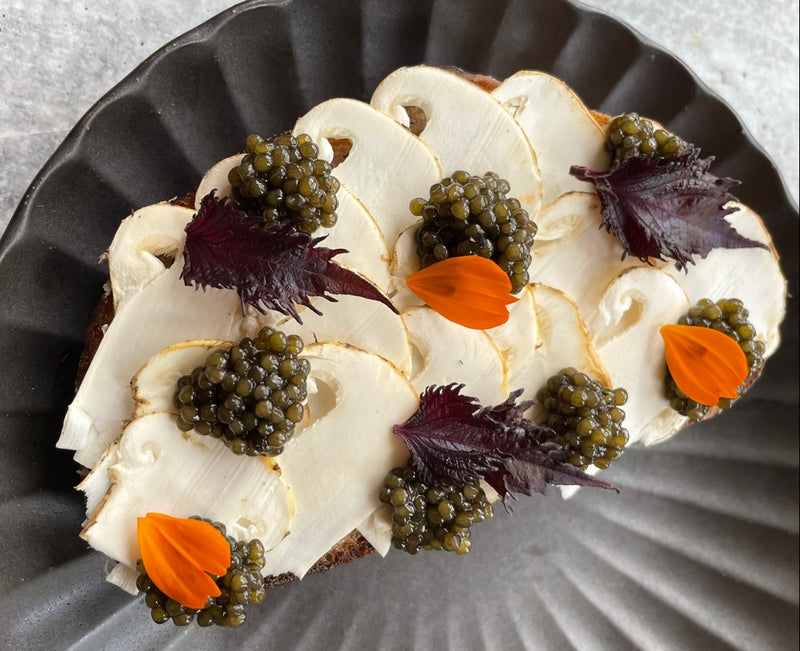 Golden kaluga, matsutake, purple shiso, toast.