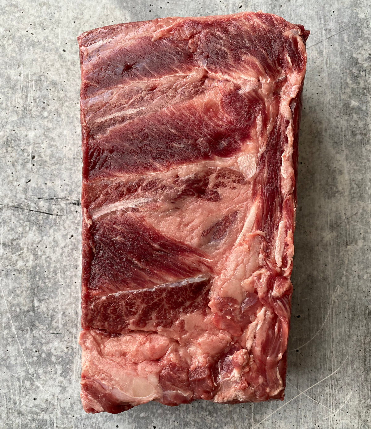 Zabuton is an often overlooked butcher's cut, coming from the underside of the chuck. Zabuton translates to "little pillow" in Japanese, referencing its highly marbled fat content, yielding a texture as soft and tender as a traditional tatami cushion. This cut also possesses an intense flavor that deepens when roasted slowly over a charcoal grill.